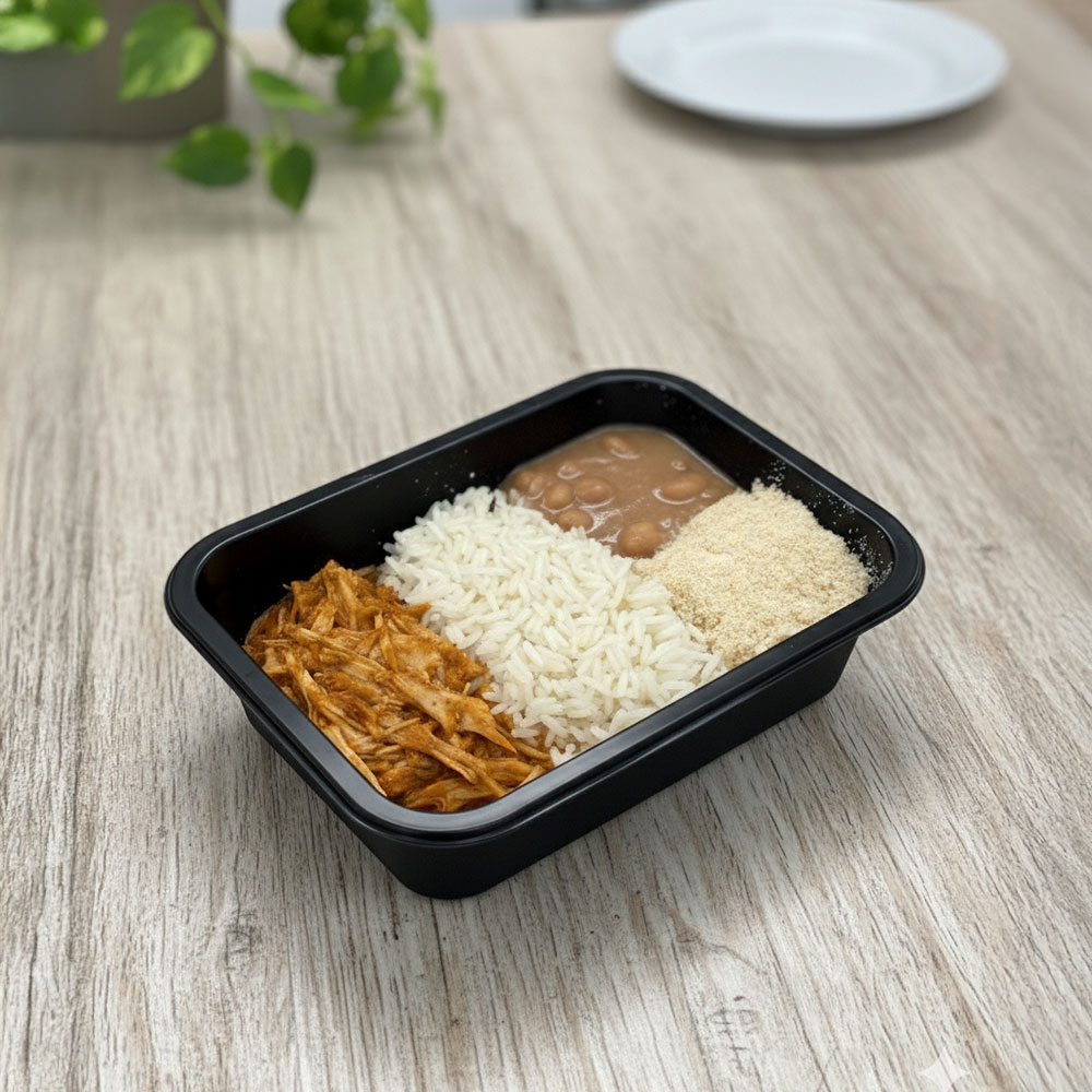Praticidade e sabor de comida caseira em uma refeição completa! O Caseirinho Suíno combina 100g de lombo suíno desfiado macio e saboroso, 100g de arroz branco soltinho, 50g de feijão carioca cremoso e 50g de farofa de cebola crocante. Uma marmita congelada de 300g que une nutrição, praticidade e aquele gostinho de feito em casa.