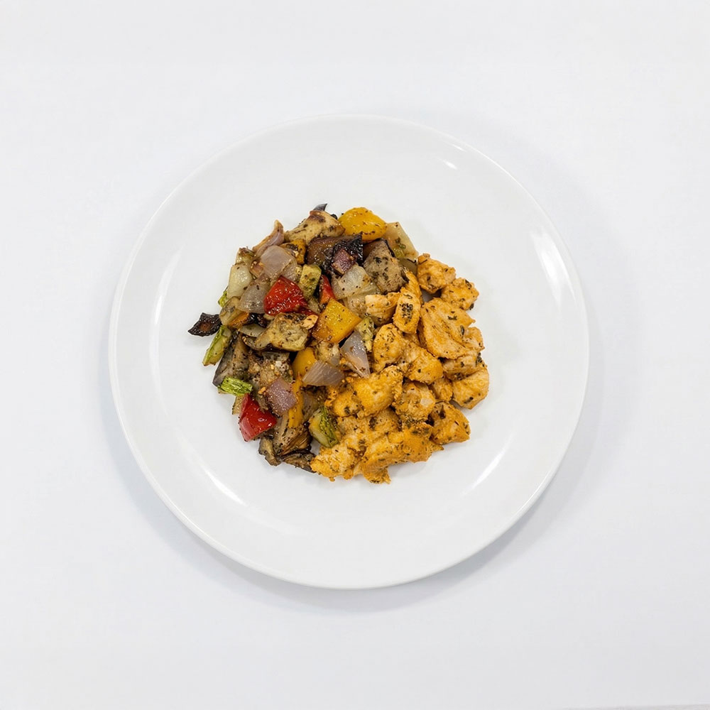 Desfrute de uma refeição equilibrada e cheia de sabor com 150g de frango grelhado acompanhado de 150g de mix de legumes, um mix assado de legumes frescos como berinjela, tomate, cebola e pimentões.