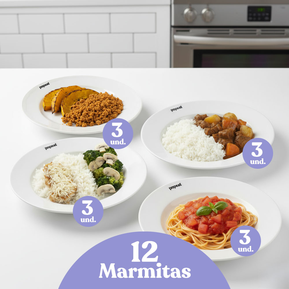 São 12 marmitas congeladas, preparadas com ingredientes frescos e combinações que deixam sua rotina muito mais saudável: